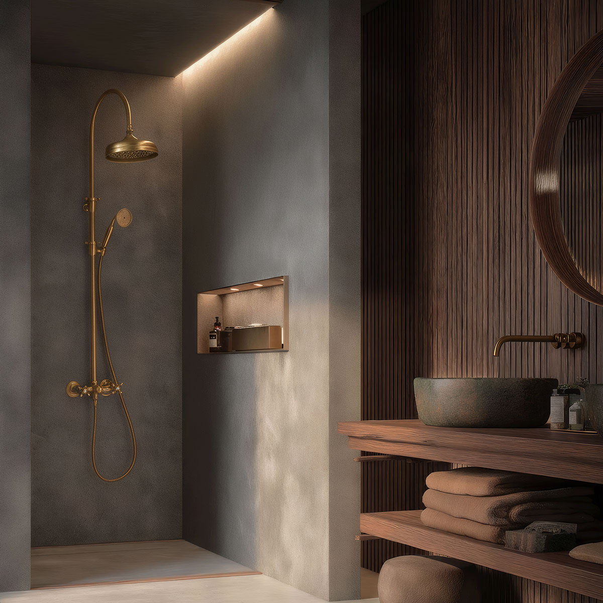 Interieurs in de winter hebben een eigen ritme. Woningen beginnen van binnenuit te gloeien naarmate het licht verzacht en de lucht vertraagt. Tijdens het vakantieseizoen vindt men luxe in warmte, introspectie en aandacht voor detail, eerder dan in overvloed.De badkamer, die vaak over het hoofd wordt gezien bij de feestelijke styling, is een van de meest verfijnde manieren om die subtiele luxe in uw huis te brengen. De hele sfeer kan worden veranderd met de juiste armaturen, vooral die met gouden en bronzen afwerkingen. Ze veranderen een utilitair gebied in een rustig toevluchtsoord dat zowel feestelijk als klassiek is.Deze metalen vragen niet om aandacht. Zelfs minimalistische badkamers krijgen een gevoel van serene grootsheid door hun gloed, die het zachte winterlicht vangt en de kille steen- en tegeltonen in evenwicht brengt.