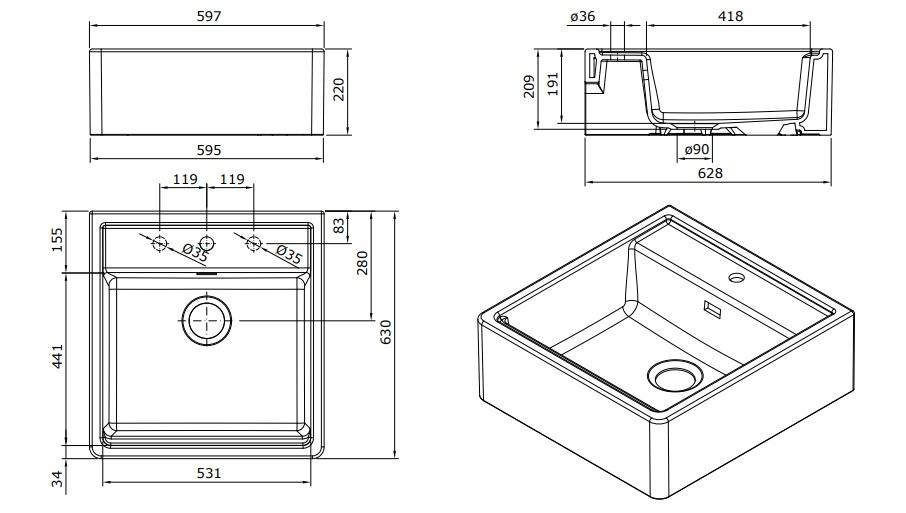 Ausmann Ceramic Panor Shade Keramische Witte Butler Spoelbak - Onderbouw en Tussenbouw 630 x 597 mm met kraangatbank en Witte plug 1208970556